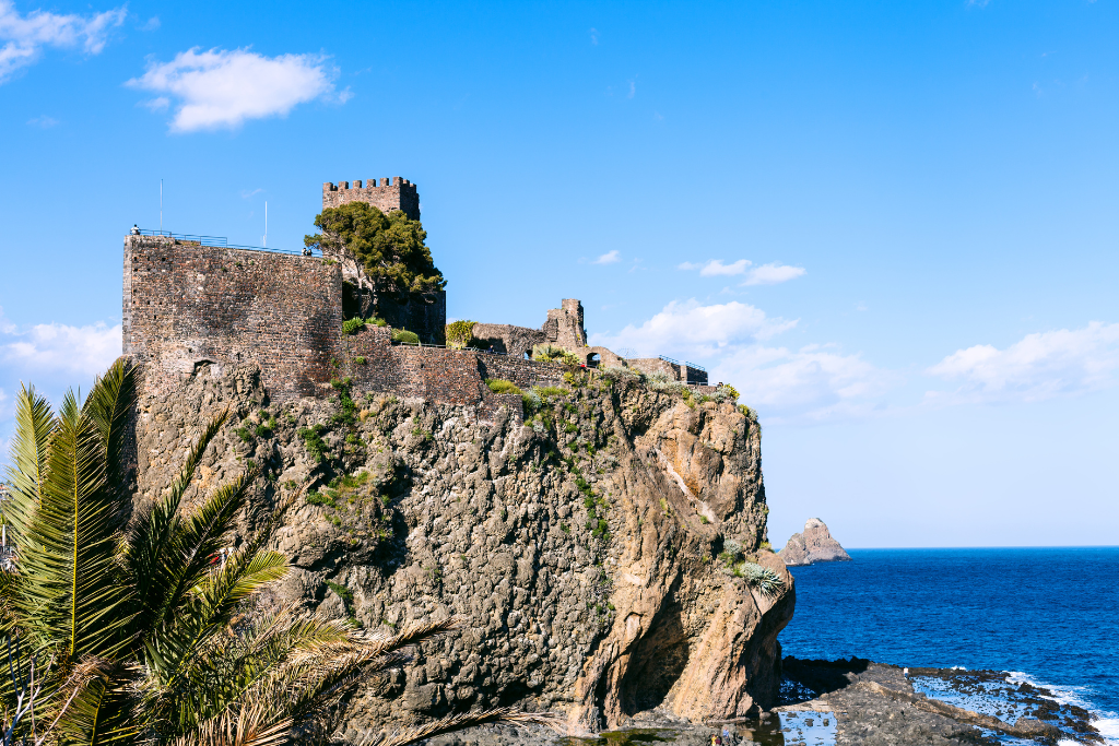 Come suggerisce il nome, questo borgo marinaro è famoso per il suo castello, costruito nel 1076 dai Normanni su un colle di pietra lavica dell’Etna a picco sul mare, che oggi domina la piazza principale. Soltanto da qui, infatti, è possibile accedere all’edificio, attraversando una scalinata in muratura, dove un tempo il ponte levatoio in legno ne segnava l’ingresso.