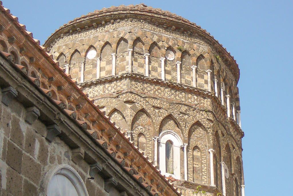 Il campanile, che si erge maestoso sul borgo, fu completato qualche decennio dopo, e già manifesta influenze gotiche. Simile a quelli di Gaeta e Amalfi, presenta una torre ottagonale sostenuta da due piani di bifore, decorata con arcate cieche e torri agli angoli.