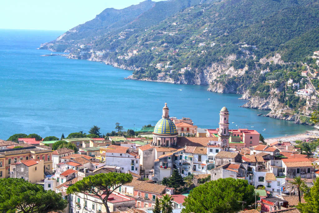 Ancora oggi, passeggiando per le strade di Vietri, si possono ammirare le tipiche mattonelle colorate che adornano case, chiese e piazze, rendendo il borgo un vero e proprio museo a cielo aperto. Oltre alla sua storia e alla sua arte, Vietri sul Mare è anche una destinazione gastronomica imperdibile, con una cucina che celebra i sapori autentici della tradizione campana. Il pesce è l’assoluto protagonista della tavola, grazie alla posizione privilegiata sul mare che garantisce un pescato freschissimo ogni giorno. Uno dei piatti più rappresentativi è la “zuppa di pesce alla vietrese”, preparata con scorfano, calamari, cozze e vongole, arricchita da pomodorini e prezzemolo. Il sapore intenso di questo piatto è esaltato dall’uso dell’olio extravergine d’oliva locale, un ingrediente che impreziosisce ogni ricetta del territorio. Anche i dolci rivestono un ruolo importante nella tradizione vietrese. Il “delizia al limone” è senza dubbio il dessert più iconico, una soffice cupola di pan di Spagna imbevuta di limoncello e farcita con crema al limone, un’esplosione di sapore che racchiude tutta l’essenza della Costiera Amalfitana. Non mancano i babà e le sfogliatelle, classici della pasticceria campana, perfetti per concludere un pasto in dolcezza.